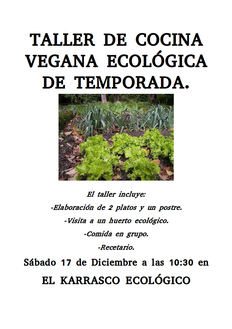 El taller se celebrará en "El Karrasco Ecológico" un huerto ecológico de la comarca de la Axarquía con productos del propio huerto que visitaremos, de ahí que sea cocina de temporada. Pretendemos que sea el primero de una serie que sirva como punto de encuentro para gente interesada tanto en el veganismo como en la ecología.